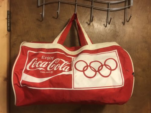 Title (ebay affiliate link): VINTAGE COCA COLA OLYMPIC RINGS Red White Duffel Bag Gym Bag.