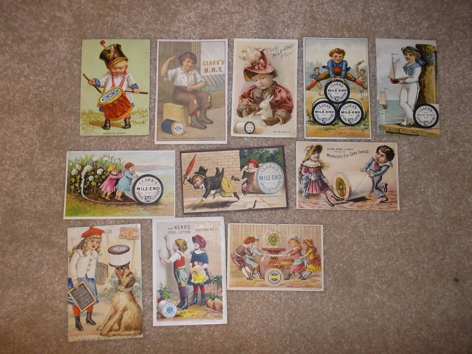 lot of 11 thread victorian trade cards - Clark''s O.N.T., Kerr''s, Merrick, etc.