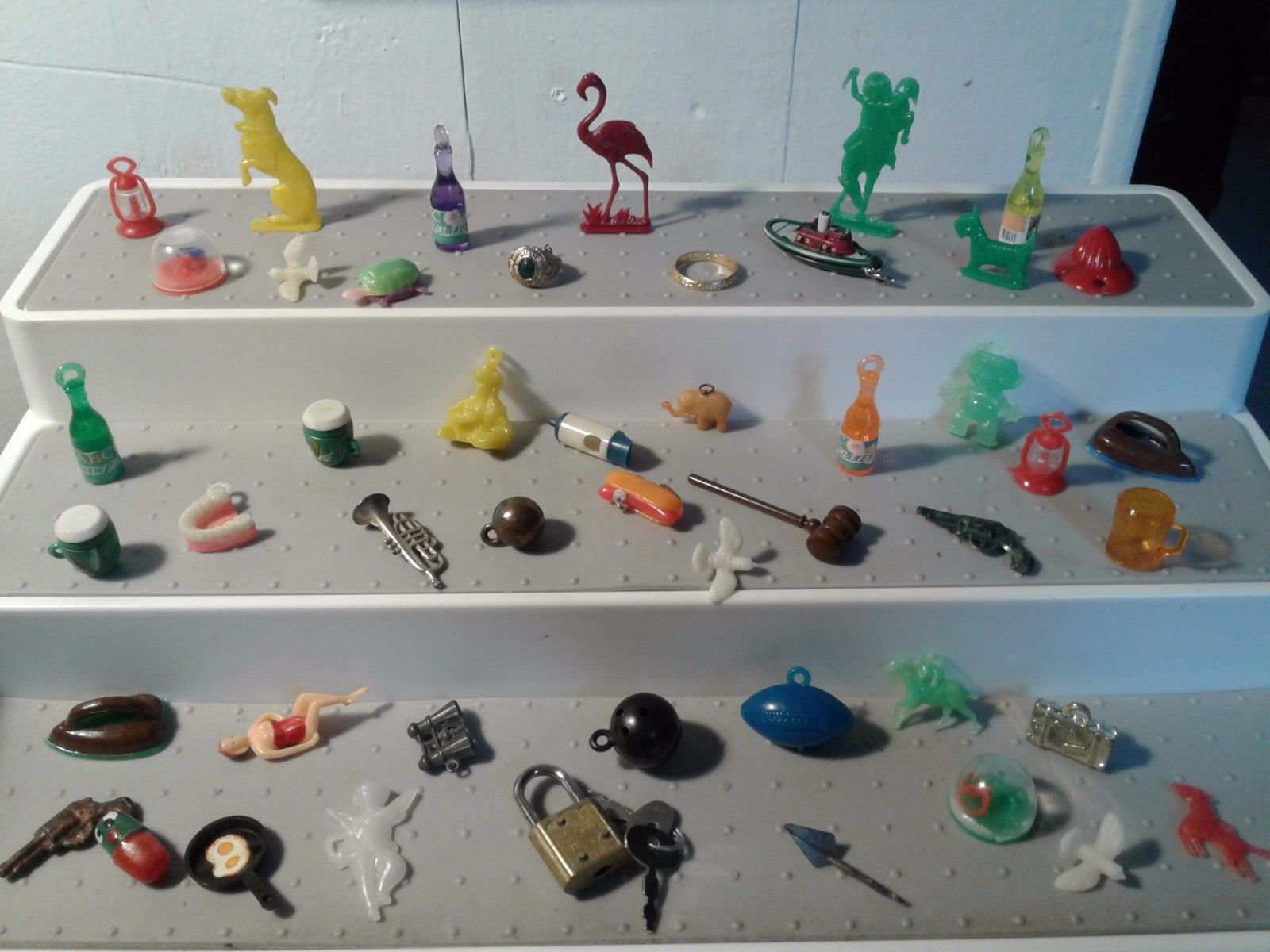 Title (ebay affiliate link): 48 VINTAGE LOT OF CELLULOID METAL PLASTIC CRACKER JACK GUMBALL TOY CHARMS