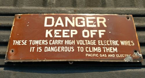 Title (ebay affiliate link): Vintage PG&E DANGER KEEP OFF Transmission Tower Brown Porcelain Enamel Sign