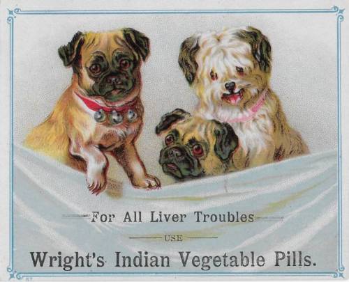 WRIGHT''S INDIAN PILLS, ANTIQUE VICTORIAN ADV CARD ~ TWO PUG DOGS & FRIEND, M