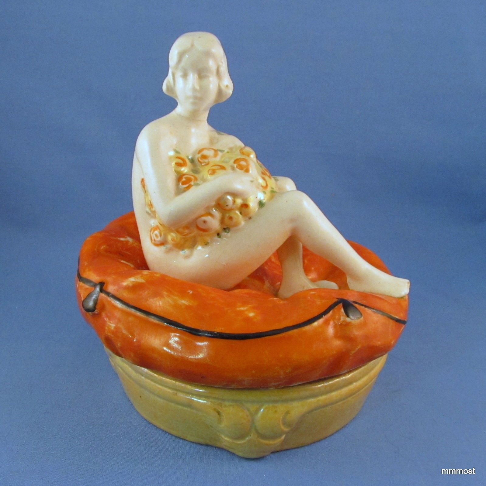 Antique 1920s Art Deco Nude Flapper Bathing Beauty Powder Box German Lustreware