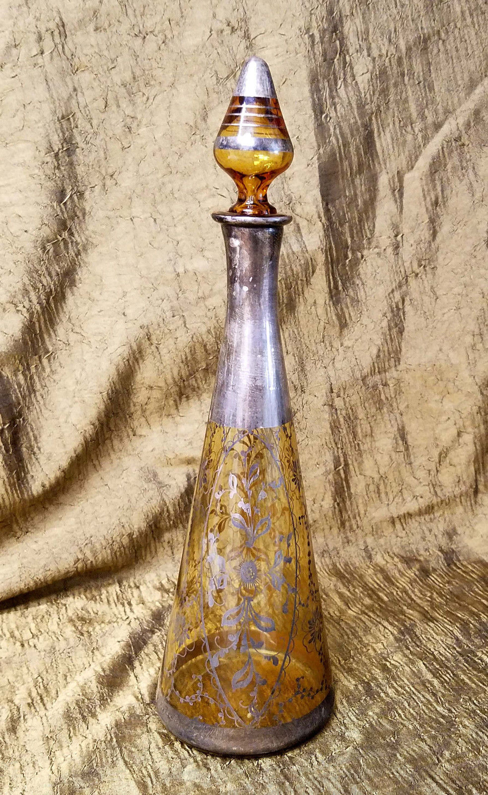 Vintage Antique Sterling Silver Overlay Amber Glass Decanter