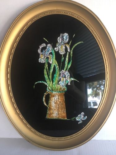 Title (ebay affiliate link): Vintage Iris Flower Art Deco Reverse Painting on Glass Foil Tinsel (Helen Rush?)
