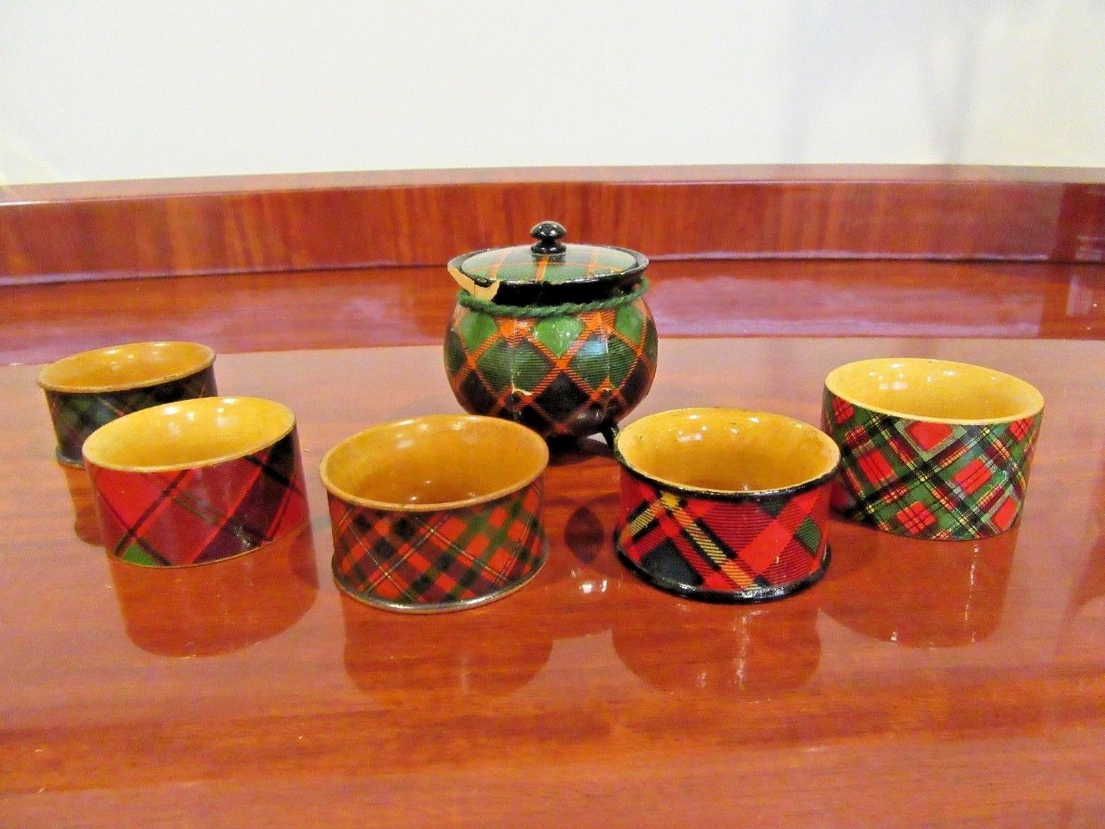 Antique Tartan Ware Lot of 5 Napkin Rings and 1 Damaged Cauldron