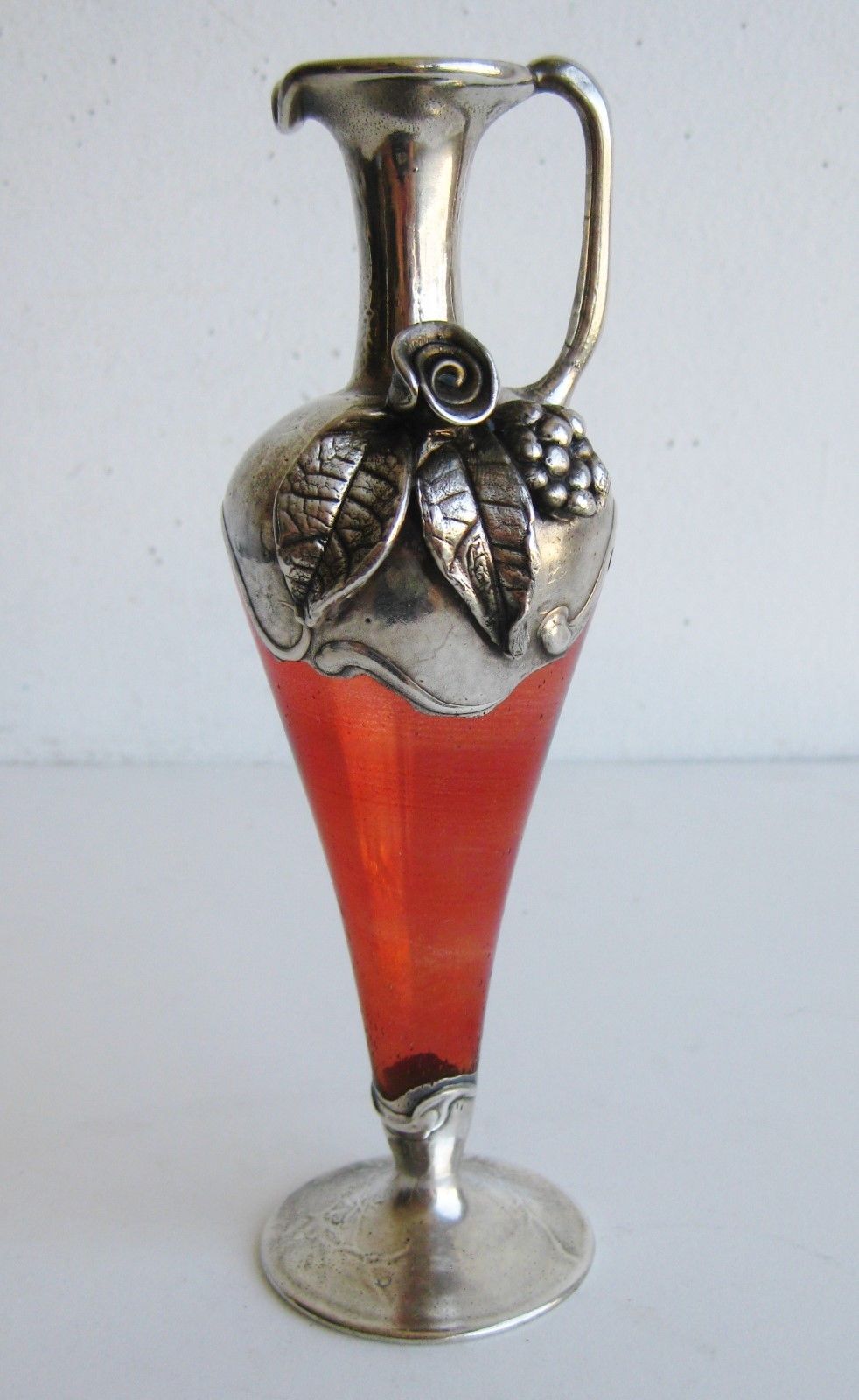 Title (ebay affiliate link): Fine Antique Sterling Silver Overlay Red Glass 7.5" Ewer Pitcher Vtg Vase