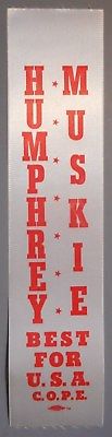 Title (ebay affiliate link): Hubert Humphrey Edmund Muskie Ribbon 1968 Presidential Election Original Mint