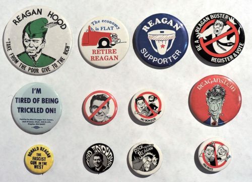 Title (ebay affiliate link): S769. VINTAGE: Lot of 12: ANTI-REAGAN Campaign Pinback Buttons (1980''s) `