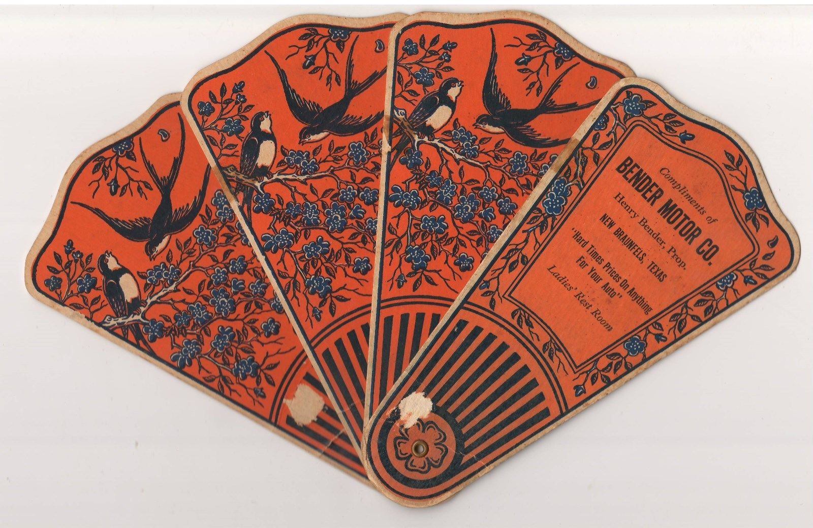 Original Vintage New Braunfels Texas Bender Motor Co Advertising Paper Fan