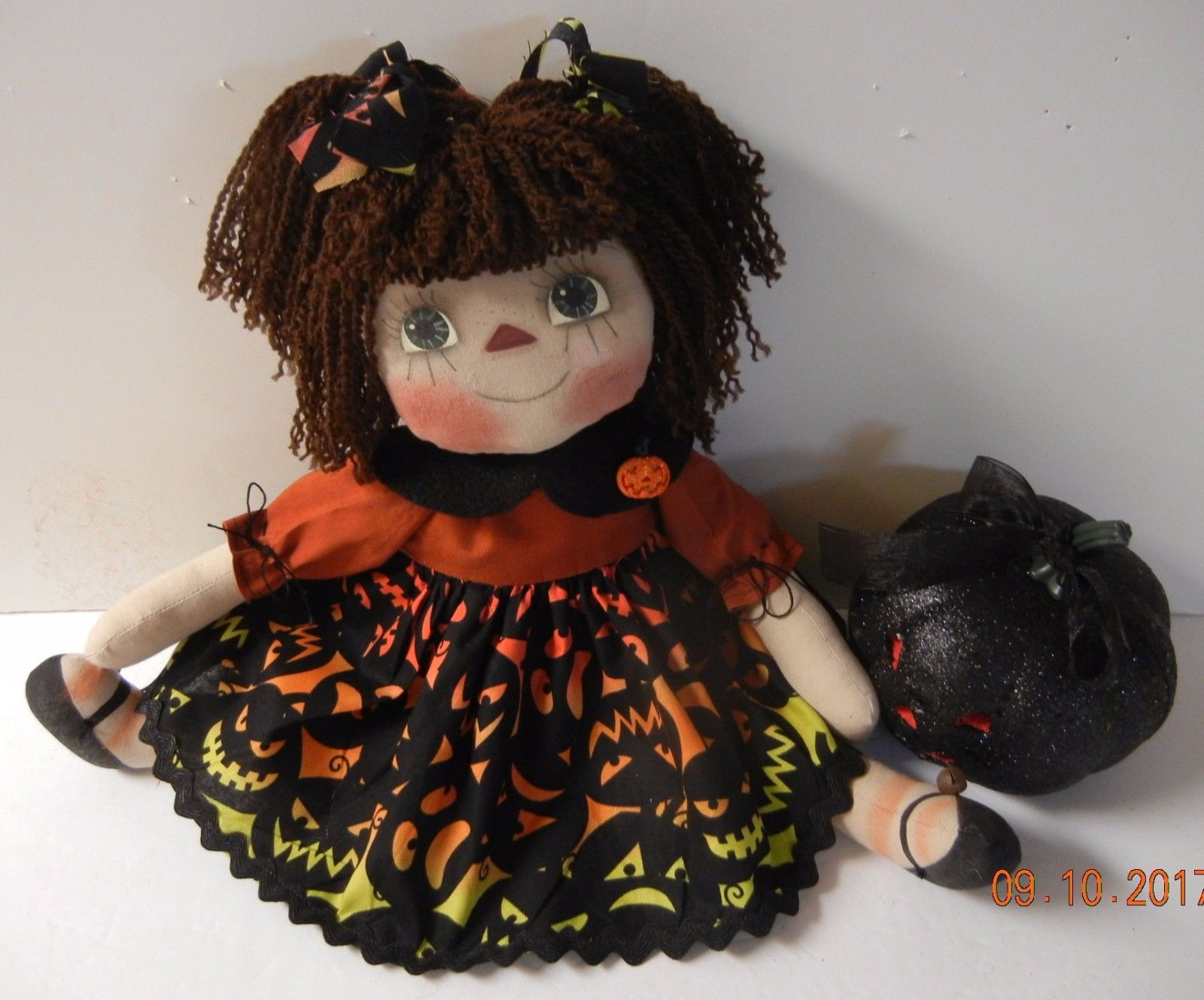 Title (ebay affiliate link): Primitive Raggedy Ann Doll "NORA"HALLOWEEN FOLK ART WITH BLACK LIGHTING PUMPKIN