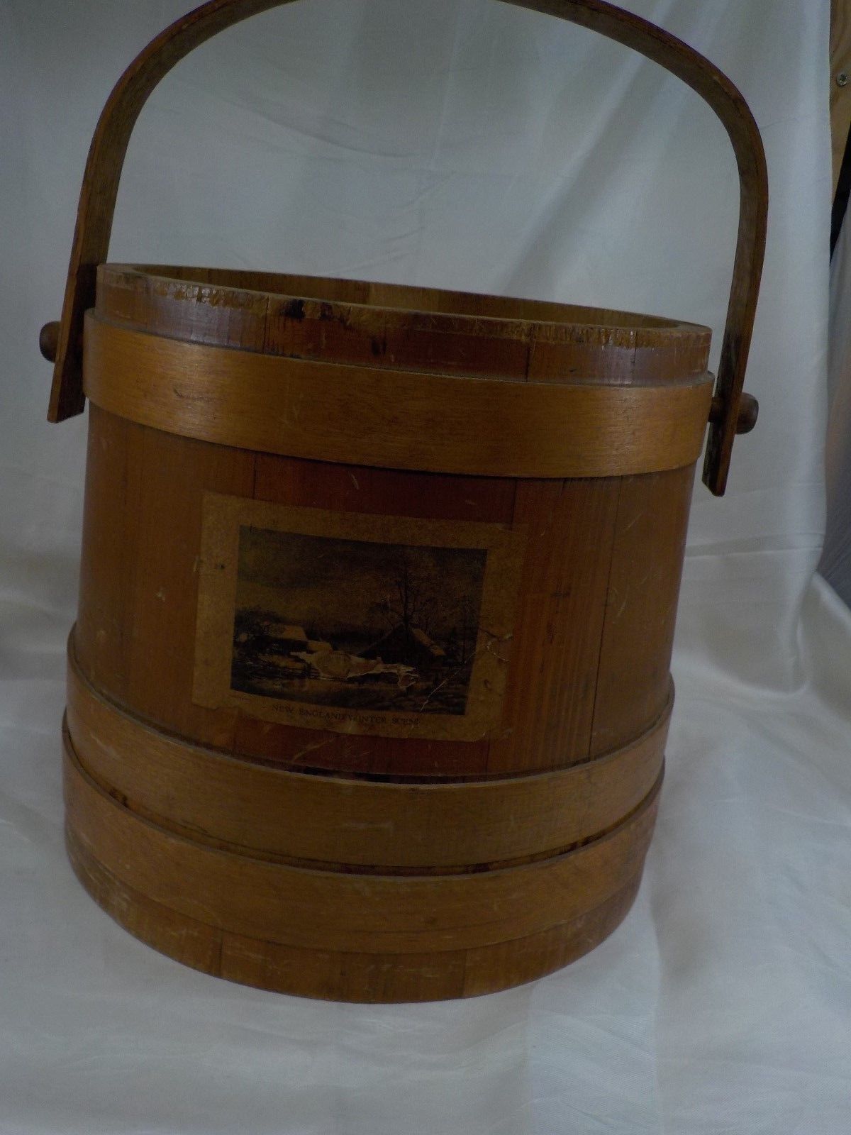 Vintage, Antique? Finger Banded Firkin Sugar Bucket Wooden 9 3/8" Currier & Ives