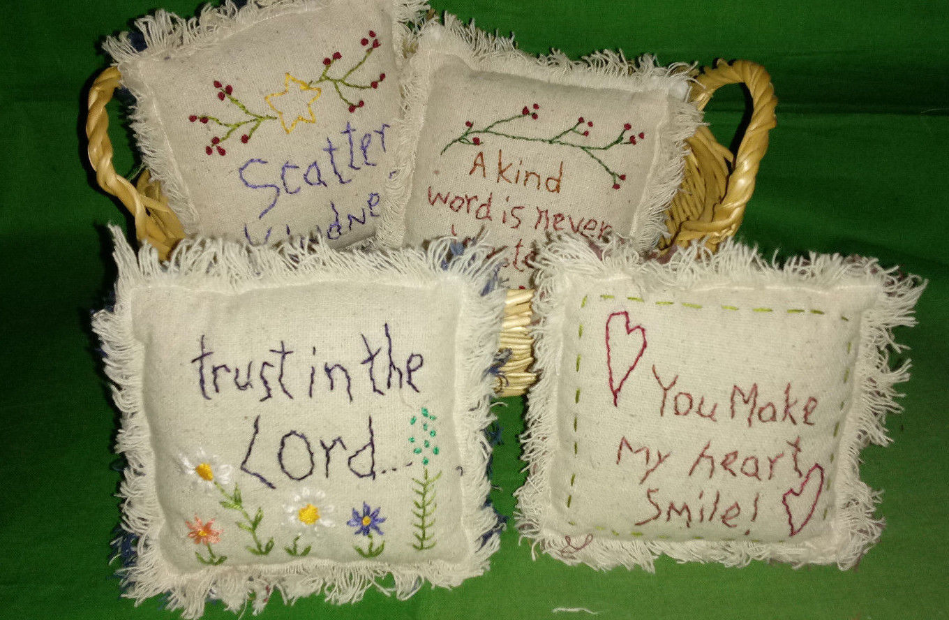 Title (ebay affiliate link): Primitive Mini Rag Pillow Hand Stitched Embroidery~~Tuck/ Bowl Fillers~Set of 4
