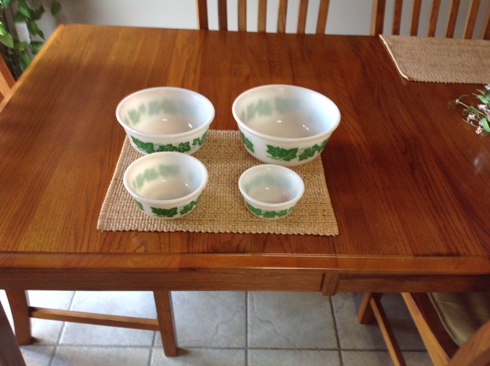 Title (ebay affiliate link): Vintage Anchor Hocking Green Ivy Milk Glass Bowls Set of 4