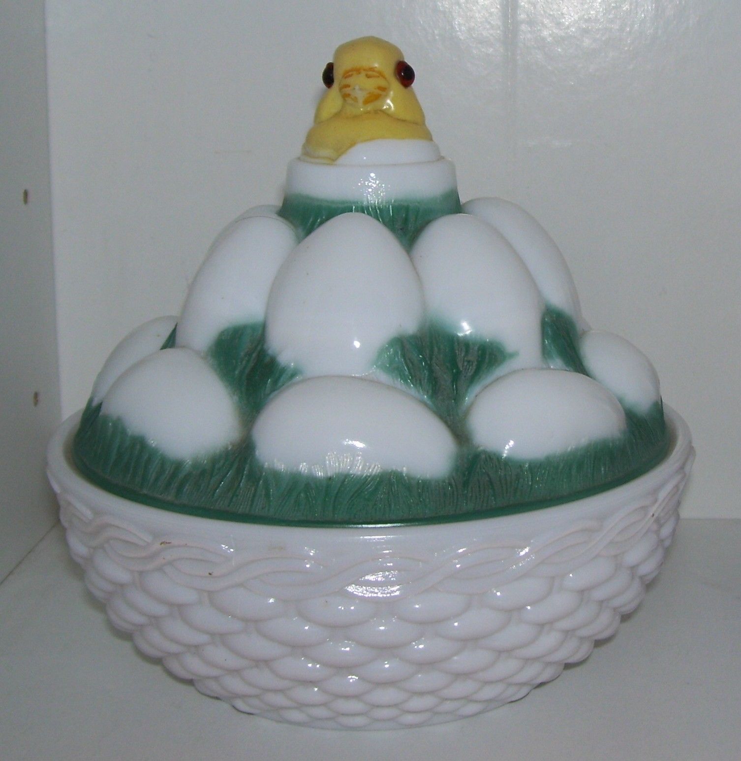 Title (ebay affiliate link): Rare Old Milk Glass Covered Candy Dish Chick Atop Nest of Eggs