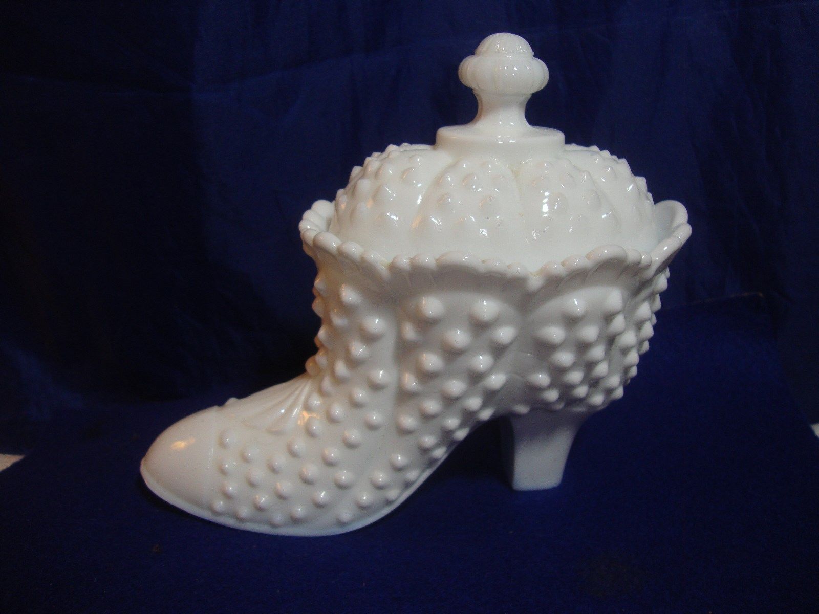 Title (ebay affiliate link): VINTAGE FENTON MILK GLASS HOBNAIL SHOE WITH LID TRINKET BOX