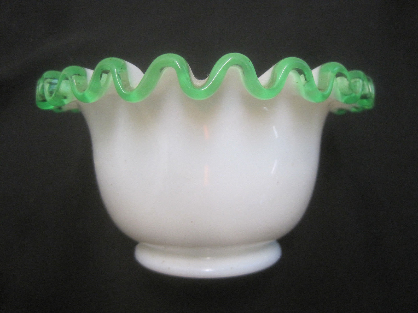 Title (ebay affiliate link): Vintage FENTON Green EMERALD CREST Ruffled Milk Glass Bowl
