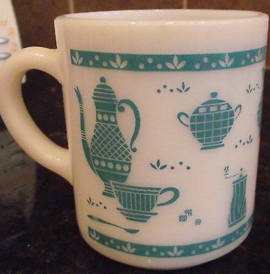 Title (ebay affiliate link): 4 Vtg. Turquoise and White Milk Glass Coffee Beverage Mugs Kitchen Aid Design