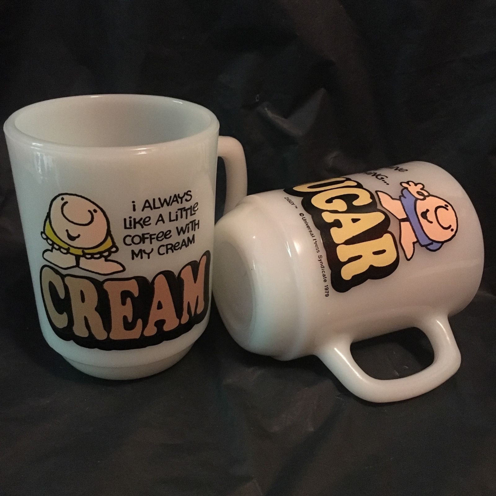 Title (ebay affiliate link): (2) vintage ZIGGY mugs-MILK GLASS-1979 USA-coffee CREAM sugar JOKES--nice UNUSED