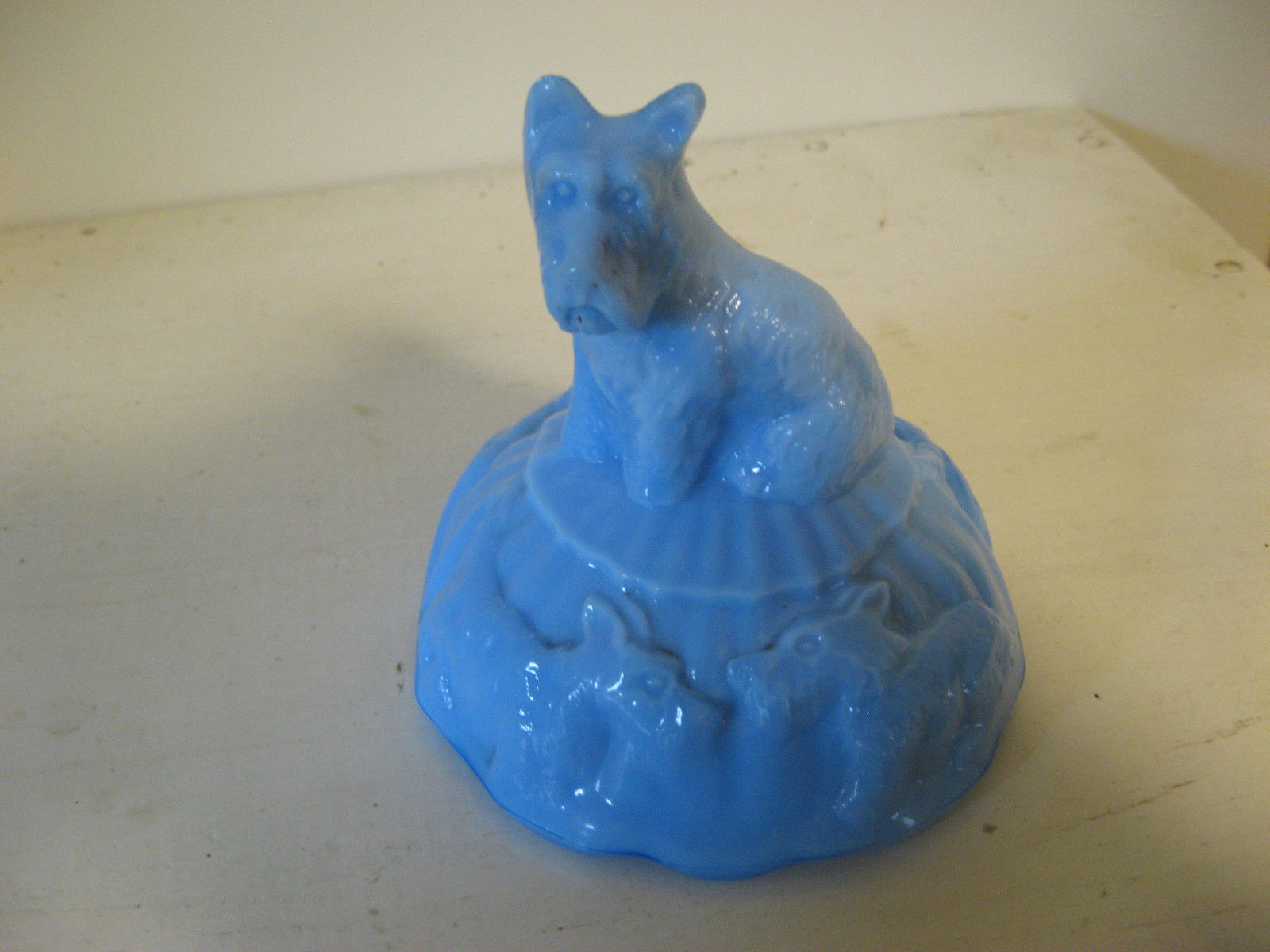 Vintage Blue Milk Glass Akro Agate Scottie Dog Powder Box Scottish Terrier top