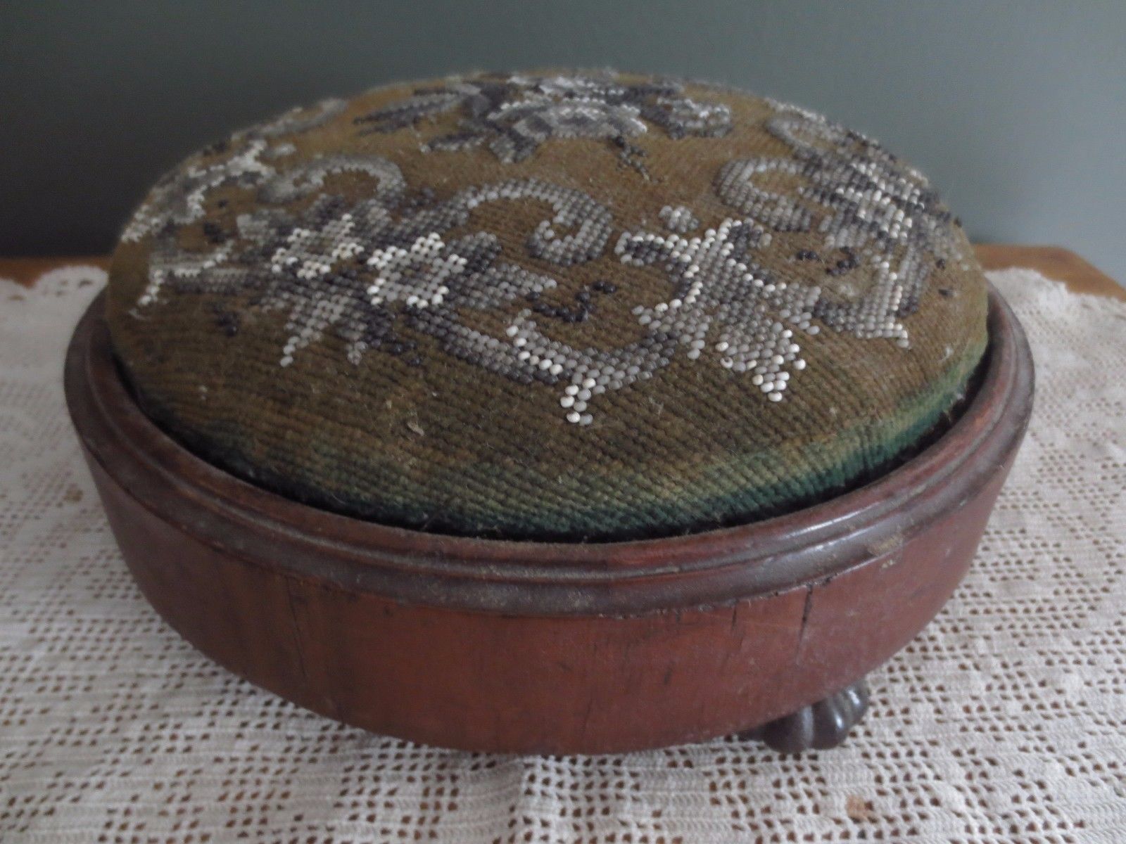 Title (ebay affiliate link): * ANTIQUE VICTORIAN ERA BEADED NEEDLEPOINT FOOTSTOOL * FLORAL * BUN FEET *