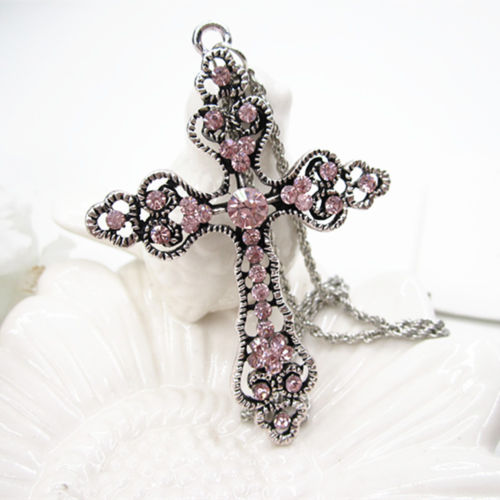 Title (ebay affiliate link): European Retro Antique Silver Plated Pink Crystal Cross Pendant Chain Necklace