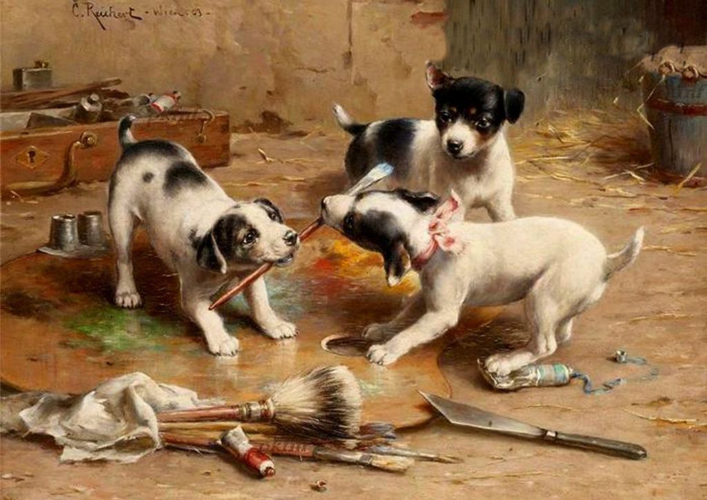 Funny Animals Dogs Puppes ART CARL RAYHERT modern card reprint