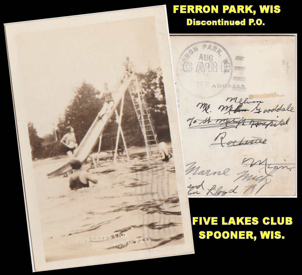Title (ebay affiliate link): SPOONER WISCONSIN RPPC SWIMMERS AT FIVE LAKES CLUB - FERRON PARK DPO CANCEL