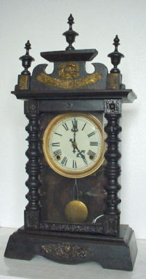 ANTIQUE 3 FINIAL HIGHLY CARVED BIG COLUMN MANTLE CLOCK
