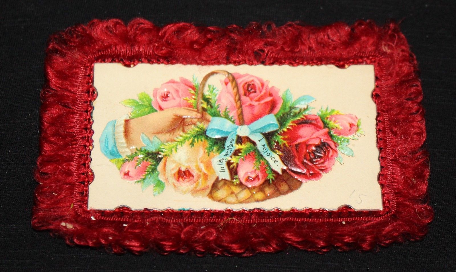 Title (ebay affiliate link): Victorian Calling Card, with Red silk Fringe. Basket of flowers, Name under.