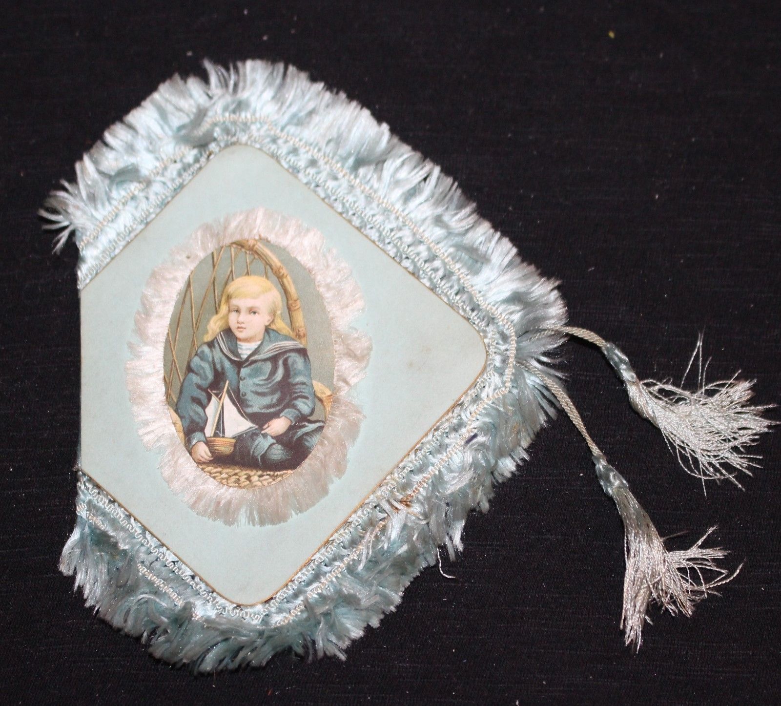 Elegant Blue Silk Fringed, Sailor Boy Christmas Card. Opens, very unusual.
