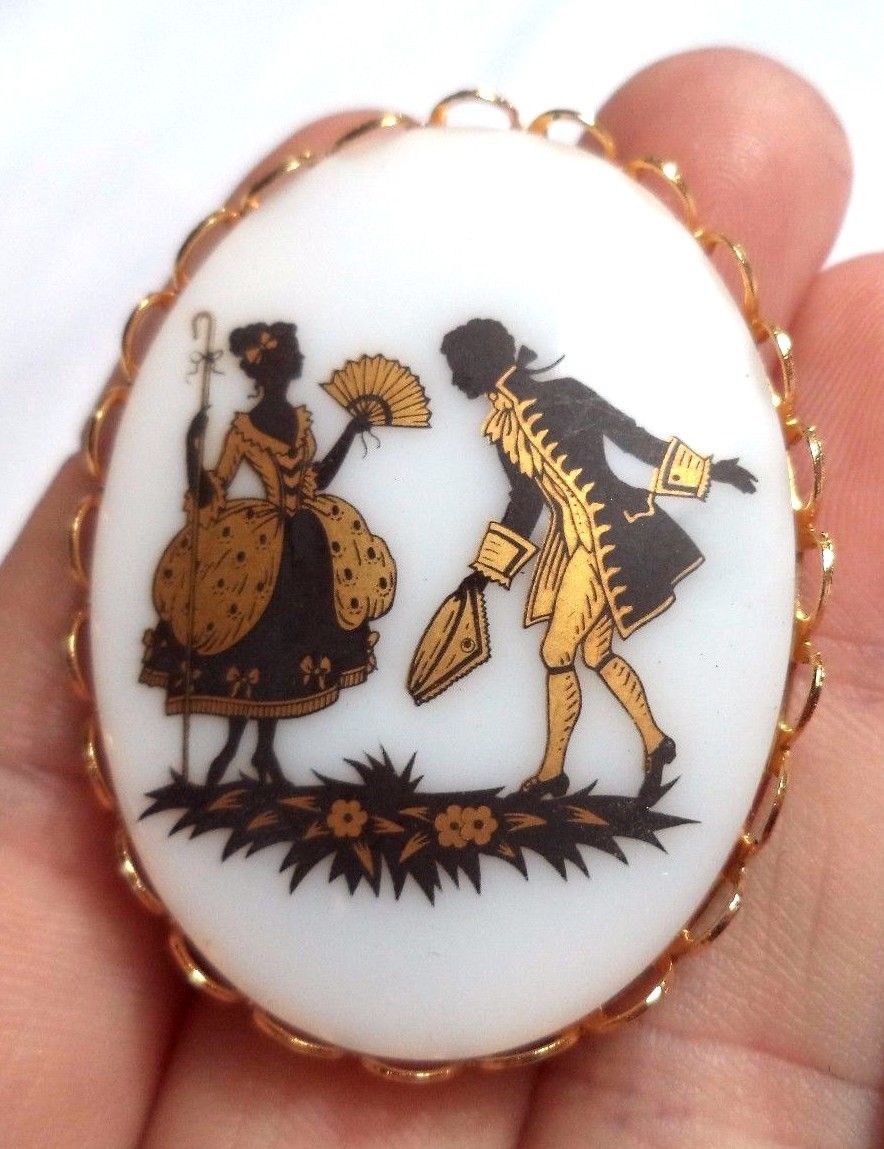 Title (ebay affiliate link): STUNNING VINTAGE ESTATE MILK GLASS FIGURES GOLD TONE 1 1/2" BROOCH!! 7679B