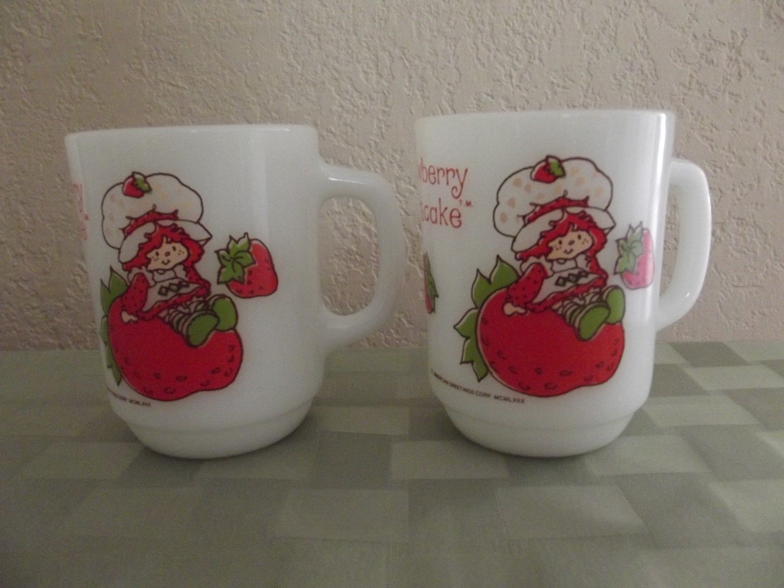 Title (ebay affiliate link): Two Vintage Strawberry Shortcake Milk Glass Mugs Anchor Milk Glass 301