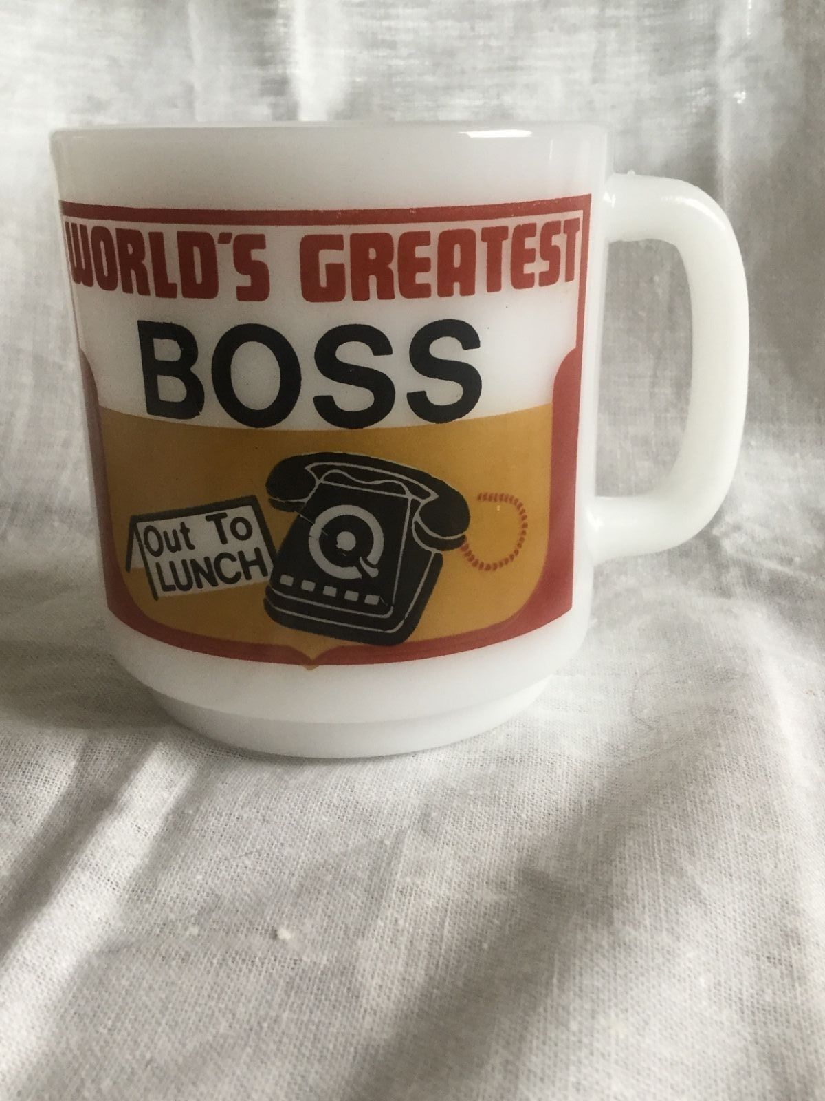 Title (ebay affiliate link): Vintage Glasbake Worlds Greatest Boss Gift Milk Glass Coffee Mug Cup Fire King