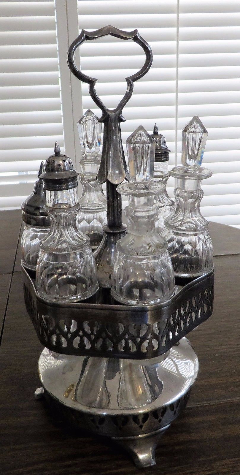 Title (ebay affiliate link): Antique Pewter Roswell Gleason Six-ring Rotating Castor Stand and Cruets