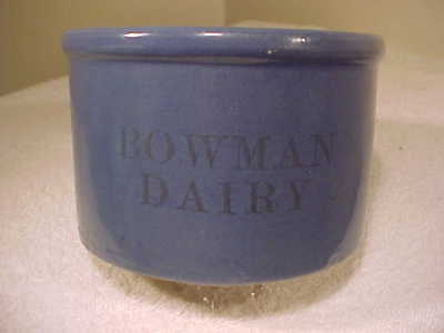 RARE BOWMAN DAIRY 1 QUART STONEWARE ADVERTISING CROCK,SUPER NICE, BLUE