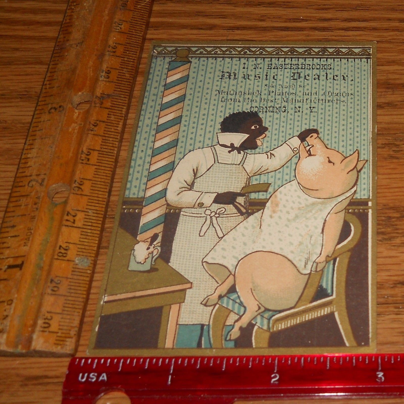 Title (ebay affiliate link): Black Americana Victorian Trade Card~Chickering Piano~Woods Organs~Barber w/Pig