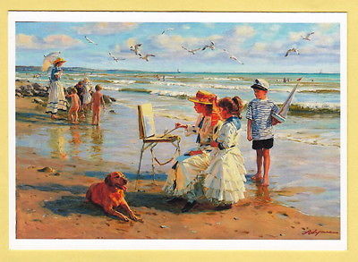Title (ebay affiliate link): Walk on the beach, mother, children and girl painter, modern postcard,