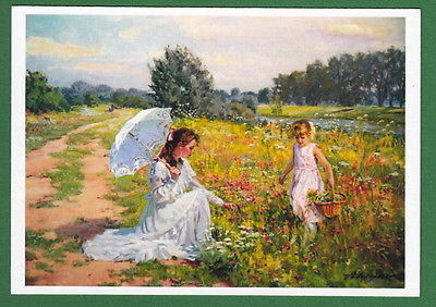 Two young ladies, umbrella, basket, field, flowers, modern postcard,