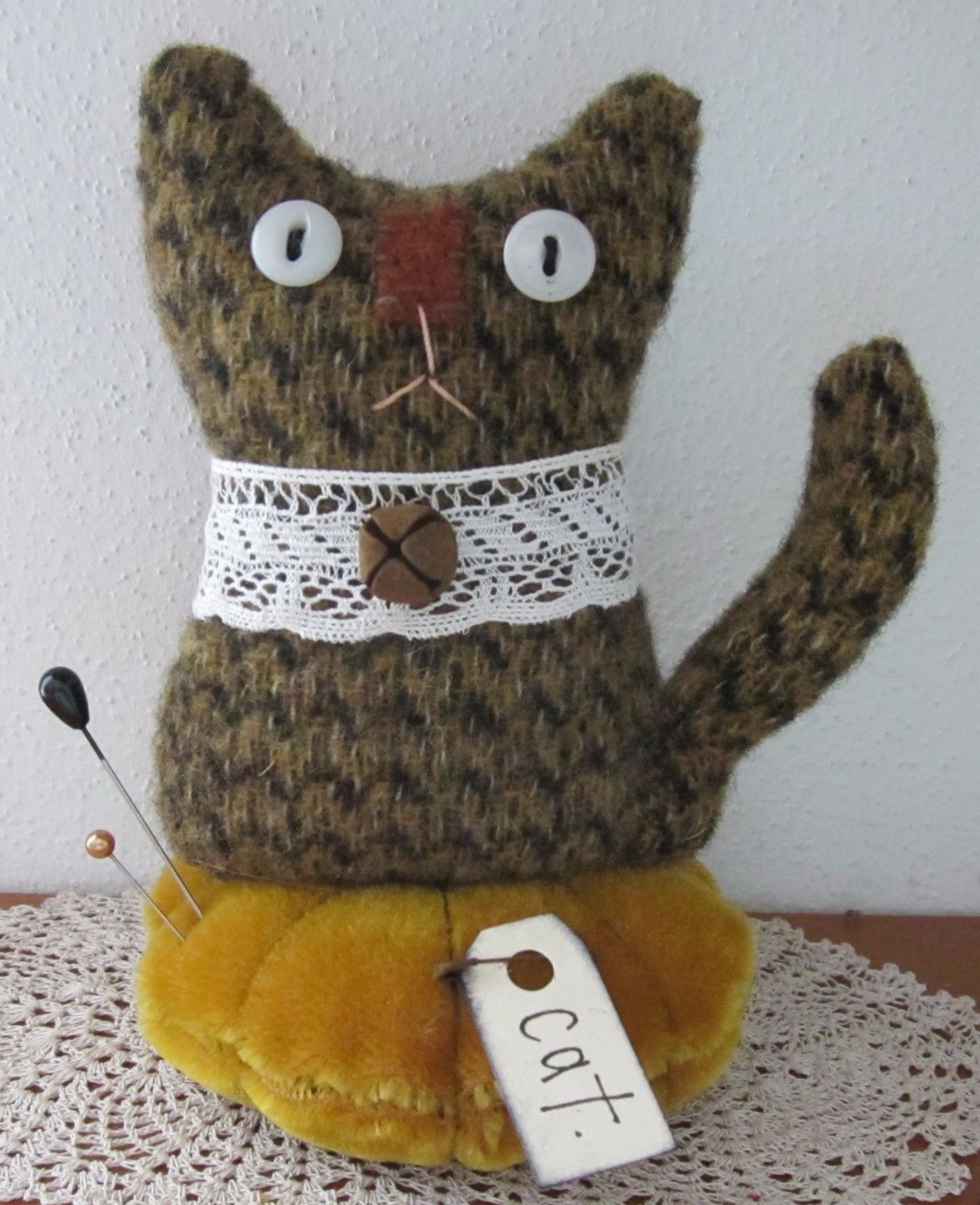 Title (ebay affiliate link): PRIMITIVE WOOL TIGER STRIPED CAT HALLOWEEN MAKE DO DOLL PIN CUSHION PFATT EHAG