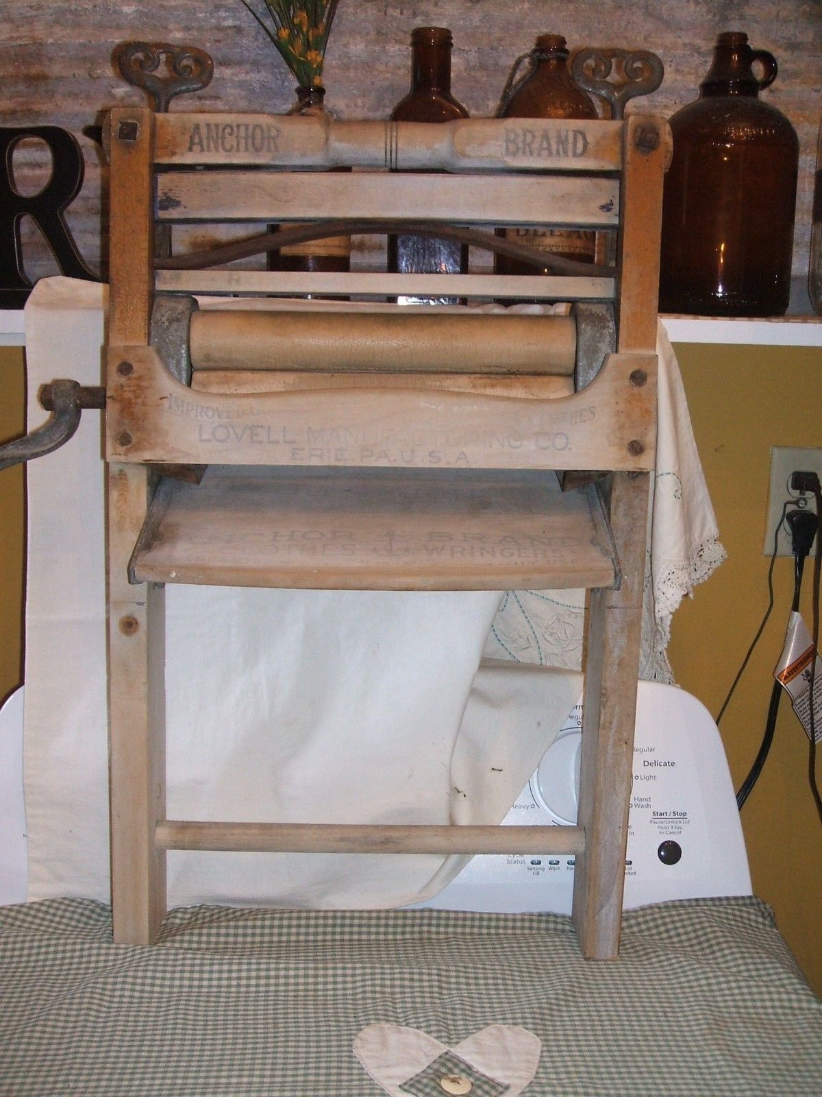 Title (ebay affiliate link): ANTIQUE PRIMITIVE WOOD HAND CRANK LAUNDRY WRINGER*** ANCHOR BRAND**