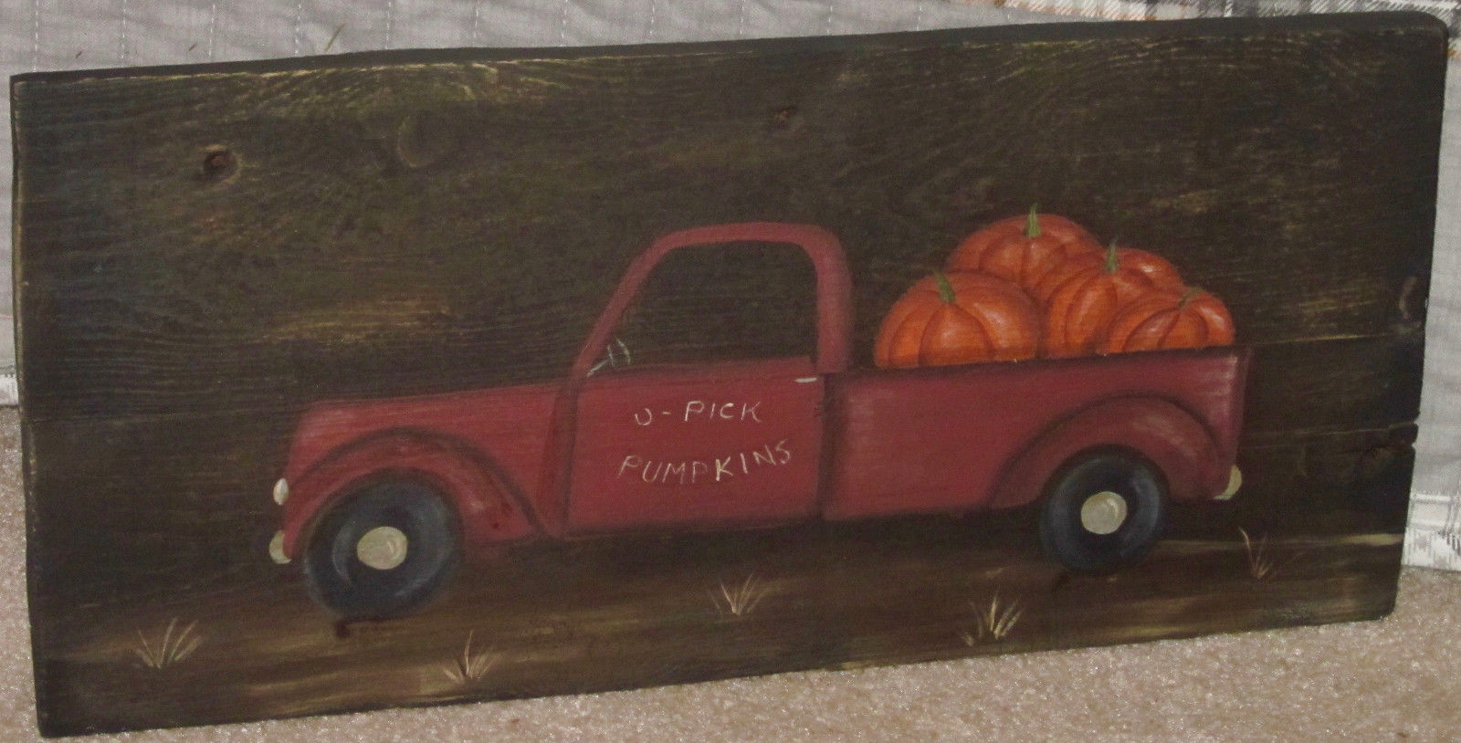 Title (ebay affiliate link): *~*PRIMITIVE*~* HP FOLK ART PRIM RED TRUCK * PUMPKINS * FALL*~* RECLAIMED WOOD