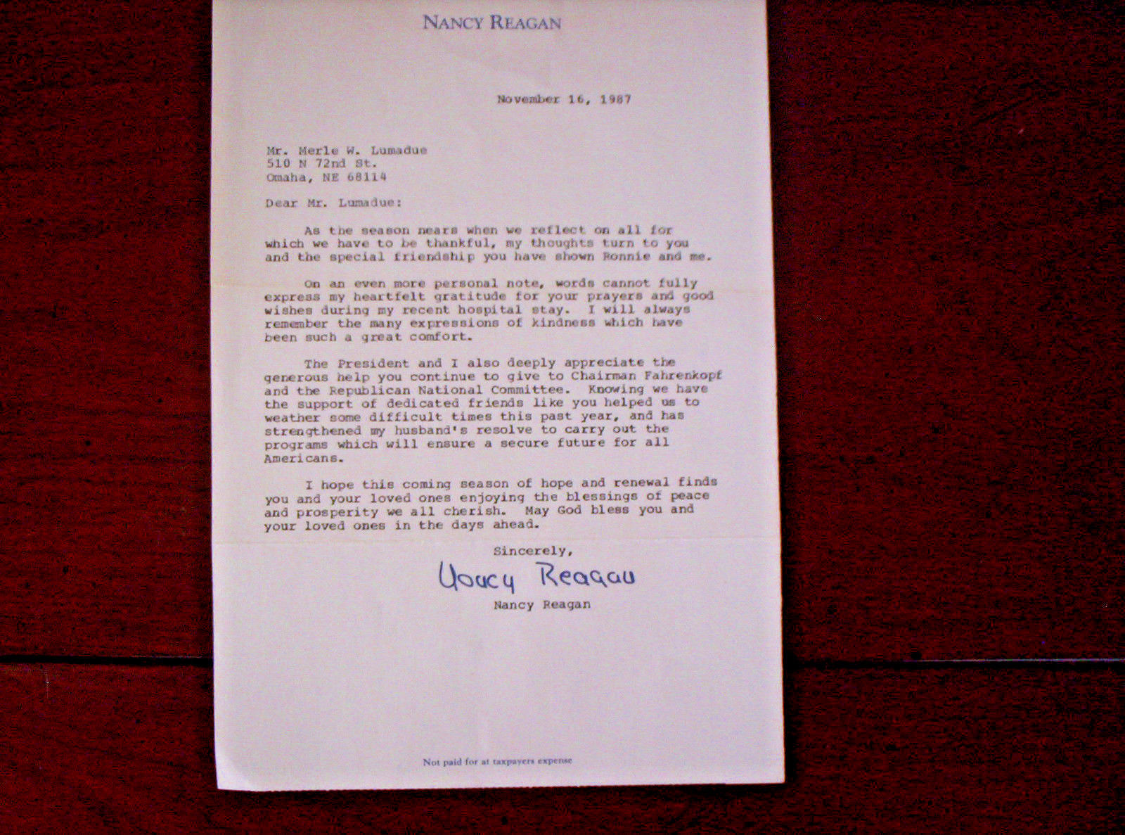 Title (ebay affiliate link): Signed Letter of Thanks from Nancy Reagan to donor- Dated November 16, 1987