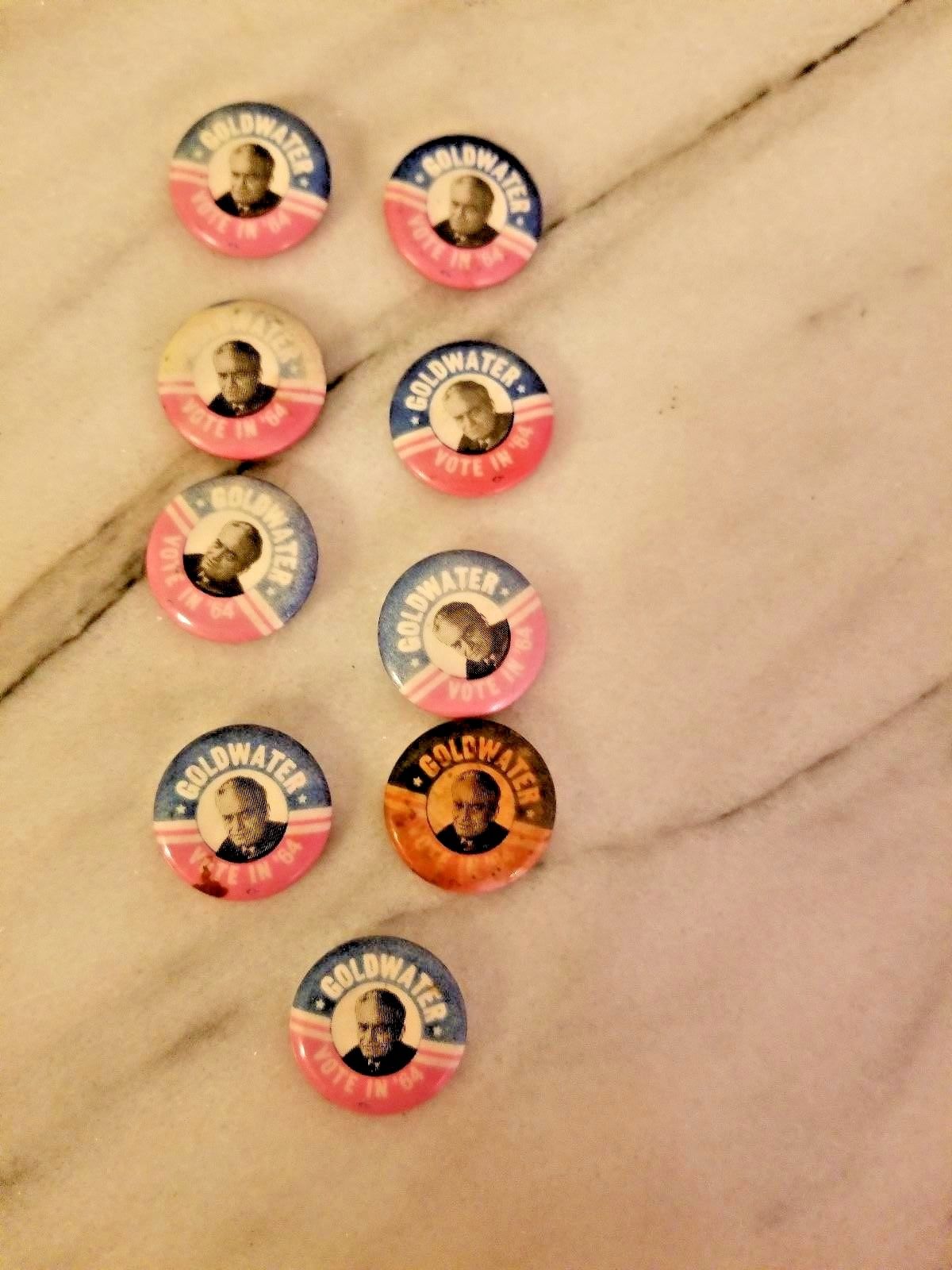 Title (ebay affiliate link): Barry GOLDWATER VOTE IN 64 BUTTON 7/8" Republican Campaign Button Pinback