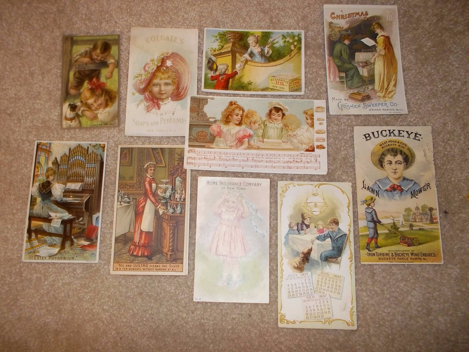lot of 10 victorian trade cards - lawn mower, organ, soap, insurance,...