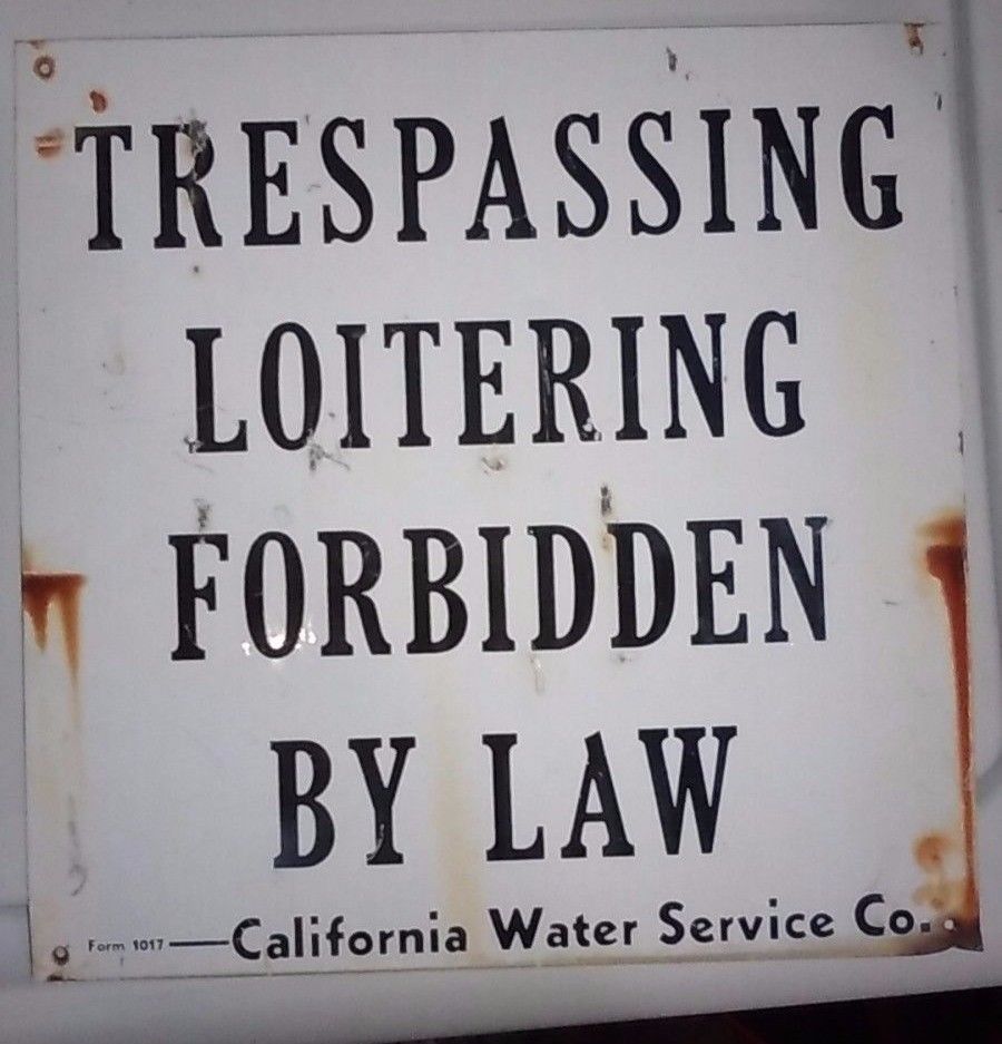 Title (ebay affiliate link): Trespassing Loitering Forbidden by Law California Water Service Co. Metal Sign
