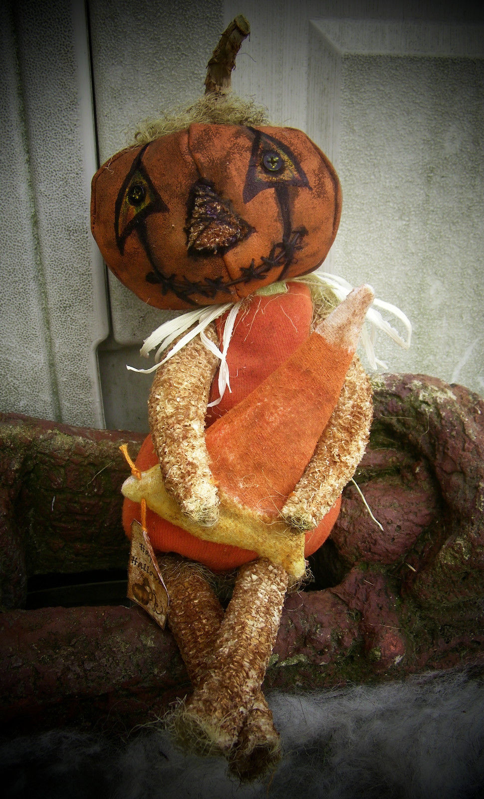 Title (ebay affiliate link): Primitive Pumpkin Head Doll Grunged Scented and Stained Holding Candy Corn