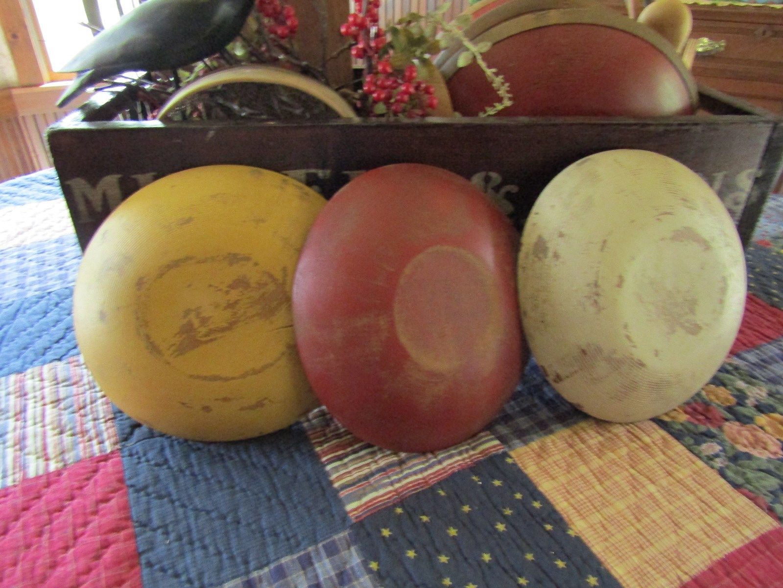 Title (ebay affiliate link): VINTAGE MUNISING BUTTER BOWLS-SET OF 3 -RED, MUSTARD, BUTTERMILK-AVG. 9" EA. DIA