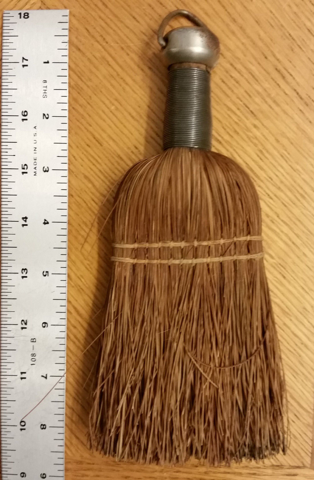 Title (ebay affiliate link): Vintage Red Straw Whisk Hand Broom with Wire Wrapped Wood Handle & Metal Knob