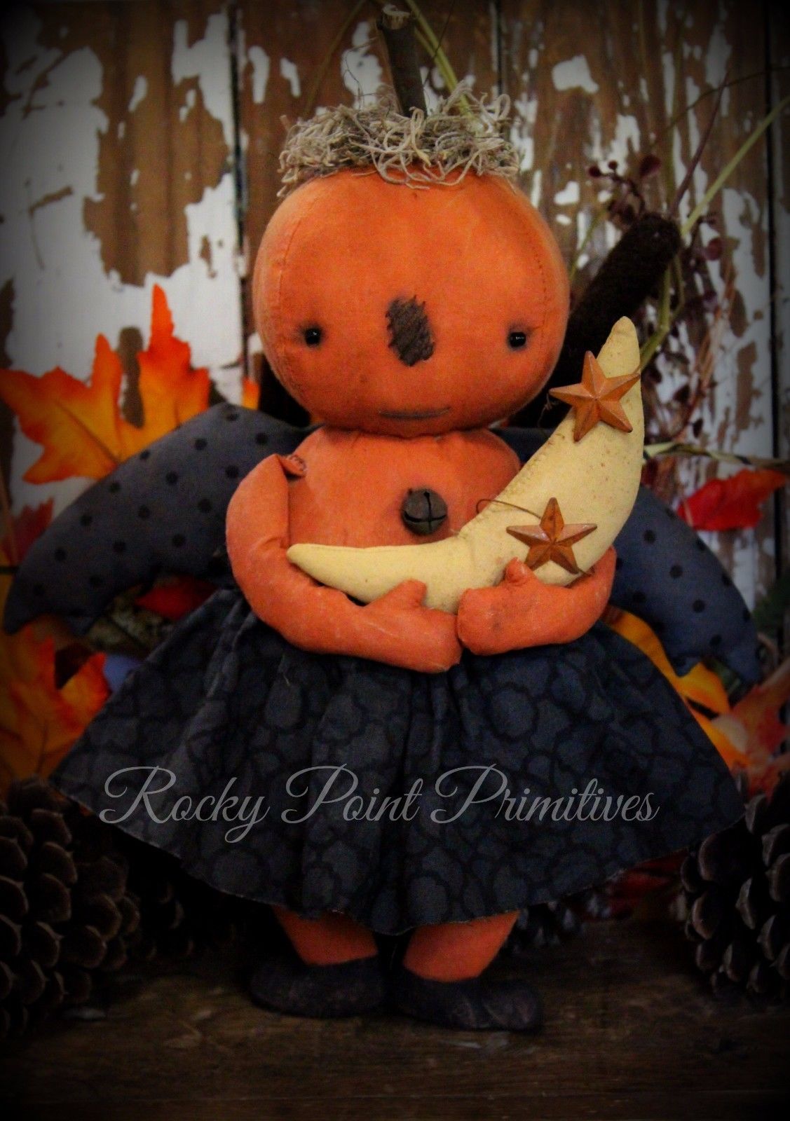 Title (ebay affiliate link): Primitive Halloween Pumpkin Bat Girl Doll with Moon