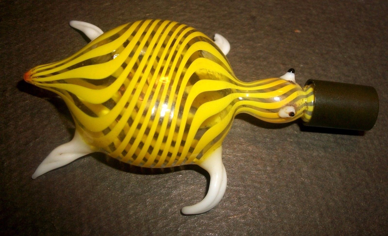 Title (ebay affiliate link): SUPER YELLOW STRIPED BIMINI ART GLASS FIGURAL TURTLE STOPPERED PERFUME BOTTLE